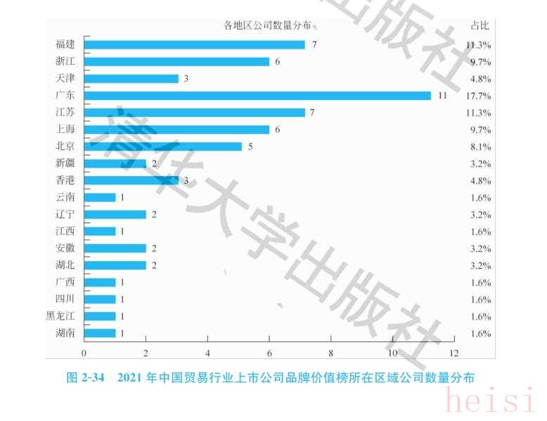 在2021中国贸易行业上市公司品牌价值榜中,62家公司来自18个地区。