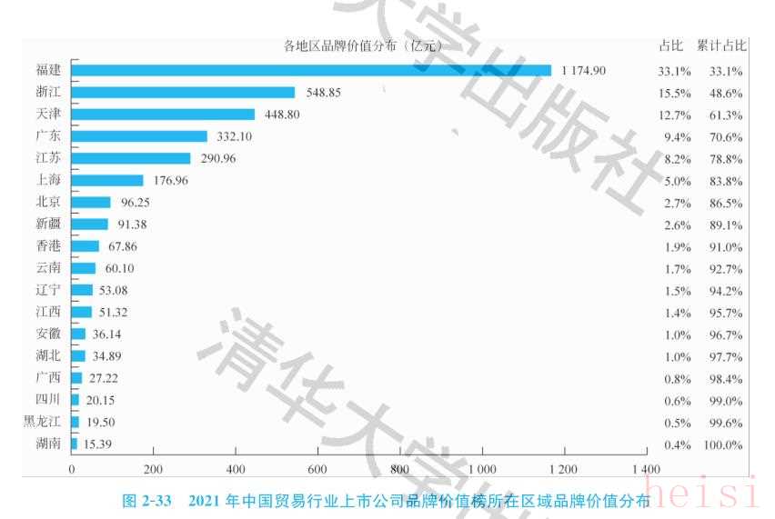 其中,来自福建、浙江和天津的公司共计16家,品牌价值合计2172.54亿元,占行业榜单总计品牌价值的61.3%,处于主导地位。其他地区企业构成情况见(图2-33)和(图2-34)。