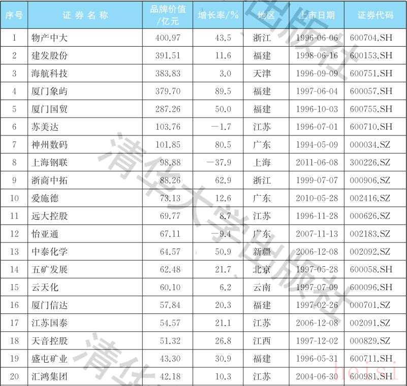 此外,在港股上市的中资股公司7家,品牌价值合计134.23亿元;在深市创业板上市的公司2家,品牌价值合计108.34亿元。