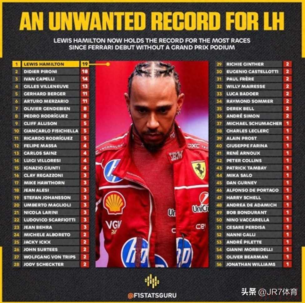 汉密尔顿代表法拉利出战至今没上领奖台,创造队史最多场数纪录