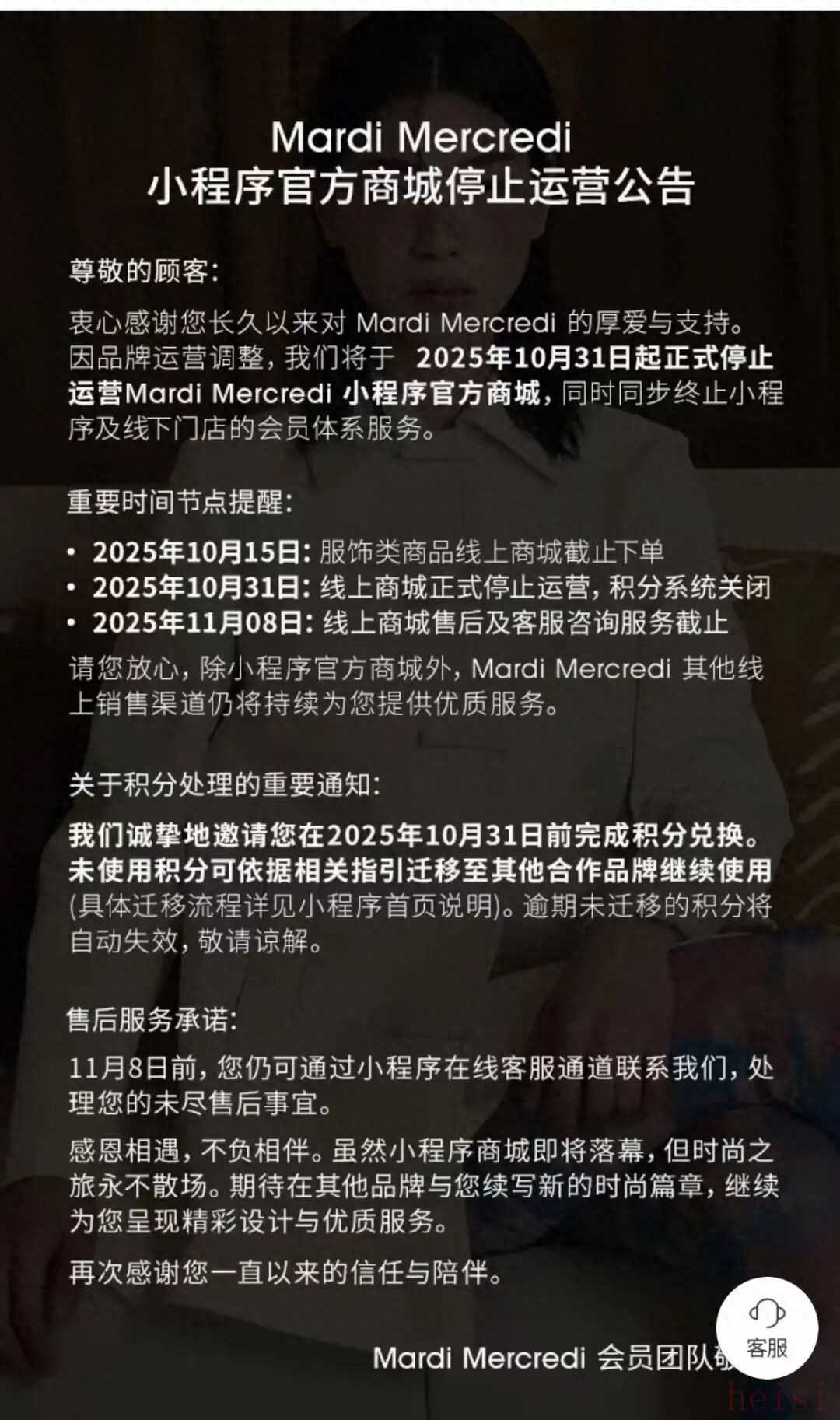 在2022年正式进入中国市场、2023年8月才开出中国首店的韩国潮流服饰品牌Mardi Mercredi,经品牌客服确认,其位于中国的所有门店都将被关闭。该品牌小程序商城也自10月31日起停止运营。其中,服饰类商品线上商城已于10月15日截止下单;10月31日起线上商城正式停止运营,积分系统关闭;11月8日,线上商城售后及客服咨询服务将截止。