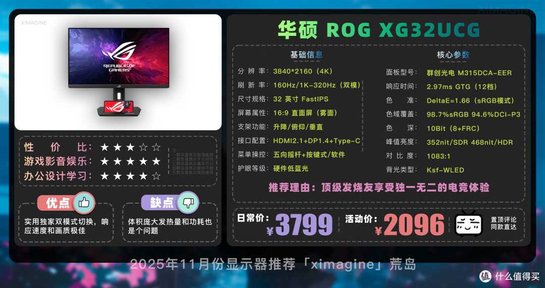 华硕 ROG XG32UCG 采用群创 DCA-EER 面板,光是 ROG 玩家国度 这个名字就代表了顶级和极致。这款显示器是为追求极致无妥协体验的硬核玩家准备的。32 寸 4K 的震撼大屏,搭配 2.97ms 的响应速度和 1.66 色准,感觉画面里的每一个元素都在为用户服务。最酷的是它的双模式切换功能,想沉浸式玩 4K 大作就切换到高清模式,想追求帧数极限就切换到高频模式,这种灵活性是其他显示器无法比拟的。它的外观设计和 RGB 灯效也充满了未来感。这是一台艺术品级别的电竞装备,每一个细节都在告诉你它很贵但它值得,2096 元的它是当前市场同规格中的顶级定位。