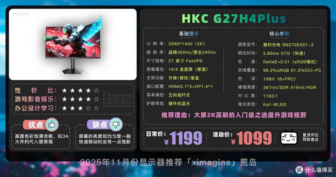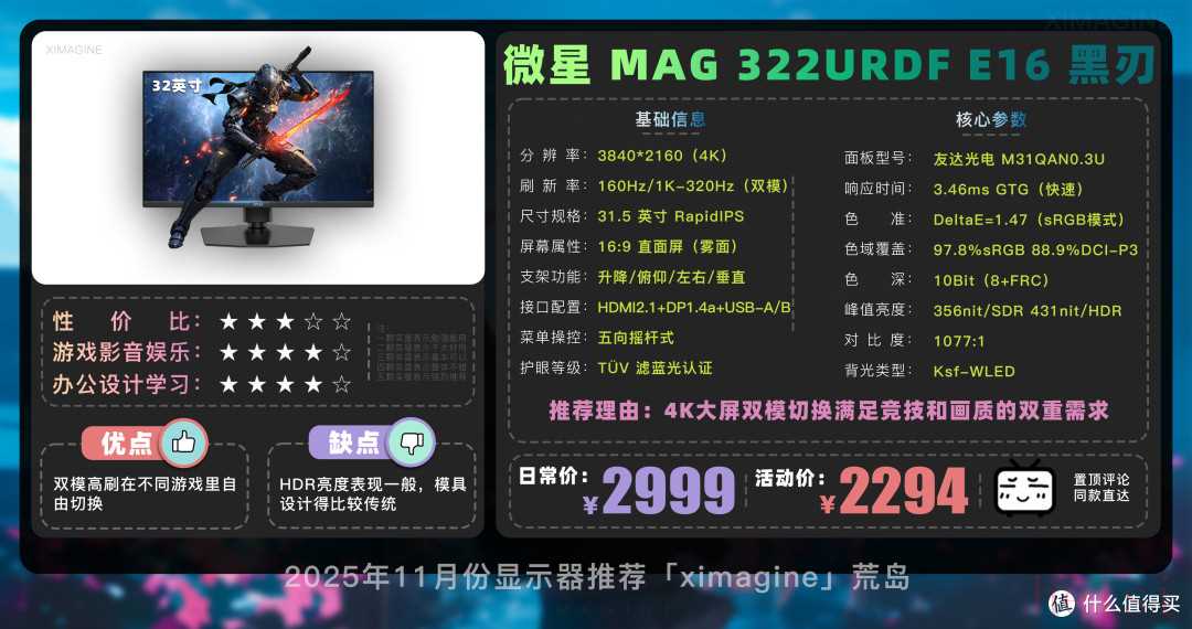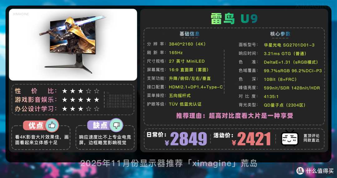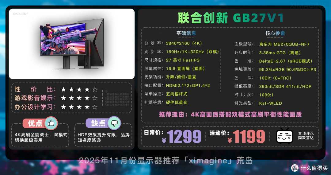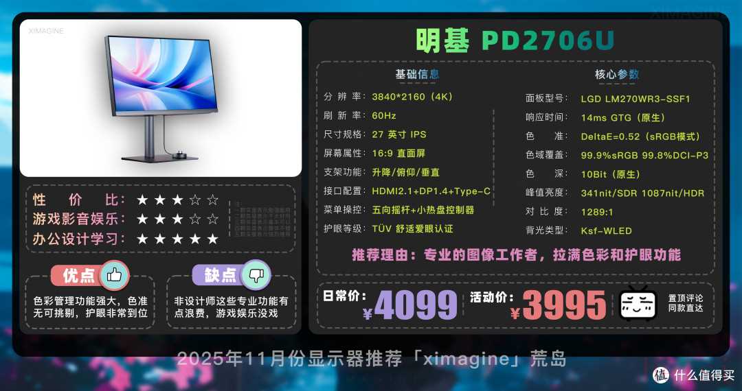 以上就是本期2025年11月显示器推荐清单,如果有心水的型号,可以戳置顶评论区对应链接拿下!记住没有最好的。显示器,只有适合你的!选购显示器,核心原则永远是预算决定上限,用途决定类型;希望看完本期视频,你已经明确了需求,不再在参数的泥潭里打转。等等党永不为奴,但早买早享受!一块好的显示器,能让你工作更高效,游戏体验直接翻倍,这是实打实的幸福感提升。本期就到这,如果觉得内容有所帮助,请三连支持!我是「ximagine」,下期再会!