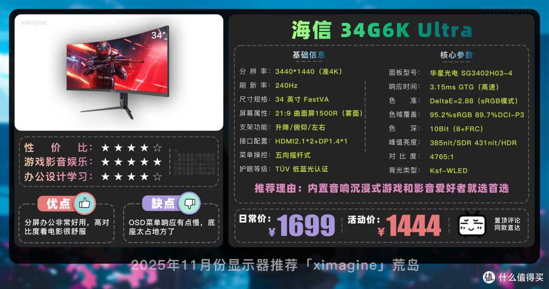 海信 34G6K Ultra 采用华星 H03-4 面板,曲面带鱼屏带来的视野沉浸感是平面屏无法比拟的。当打开一款支持 21:9 比例的 3A 游戏时,感觉整个世界都把自己包裹起来了,尤其是在赛车游戏或太空探索游戏中,视觉体验极其震撼。对于办公人士来说,这个超宽屏简直就是一块天然的分屏工具,可以并排放置三四个文档窗口,极大地提高了多任务处理效率。FastVA 面板带来的 4765:1 高对比度,让画面黑得更纯粹,看电影时暗部细节更丰富。虽然它的 1500R 曲率需要时间适应,但一旦习惯了就会爱上这种宽广的视野。1444 元的它性价比在同类产品中非常突出。