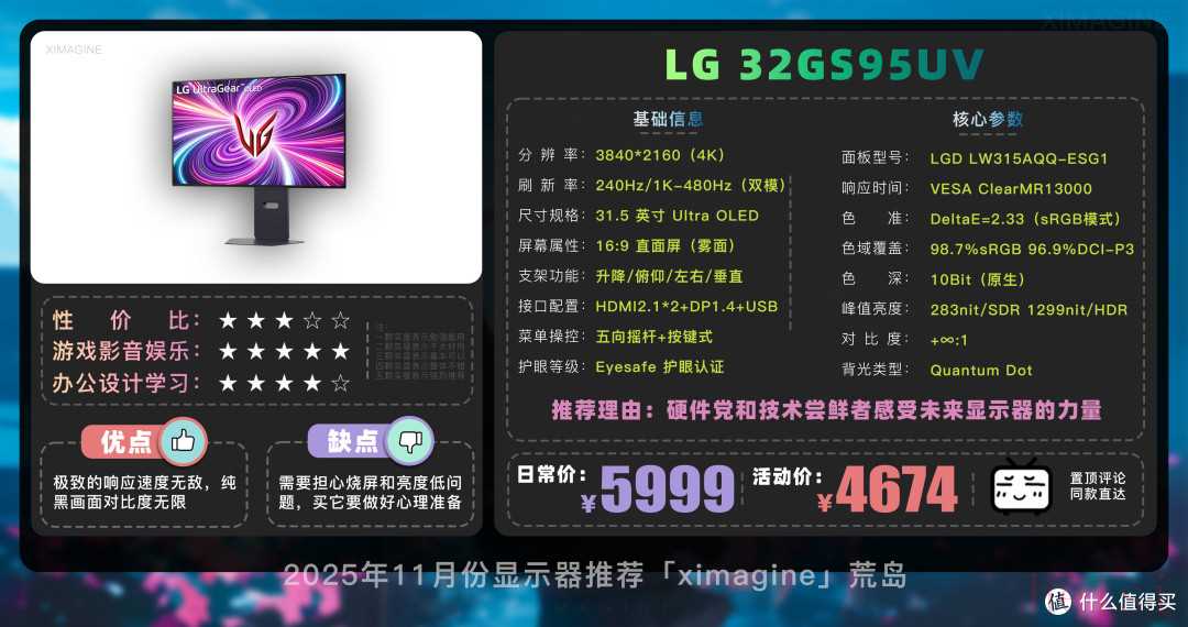 LG 32GS95UV 采用 LGD 自家 AQQ-ESG1 面板,简直是性能的暴力美学。Ultra OLED 带来的纯净黑色和无限对比度,让你在玩游戏和看电影时,画面质感直接提升一个档次。最颠覆认知的是它的双模功能。当我需要玩 COD 追求极高帧率时,一键切换到 1K-480Hz 那种丝滑流畅的感觉无法用语言形容;而切换到 4K-240Hz 时,它又立刻变身成为画质旗舰。它的支架和模具设计也充满了科技感。刚上市购买它需要考虑的是其高昂的价格和 OLED 的使用习惯,现在腰斩到一半 4647 元的它带来的极致体验会让你觉得物有所值,是目前市场上的顶级旗舰。