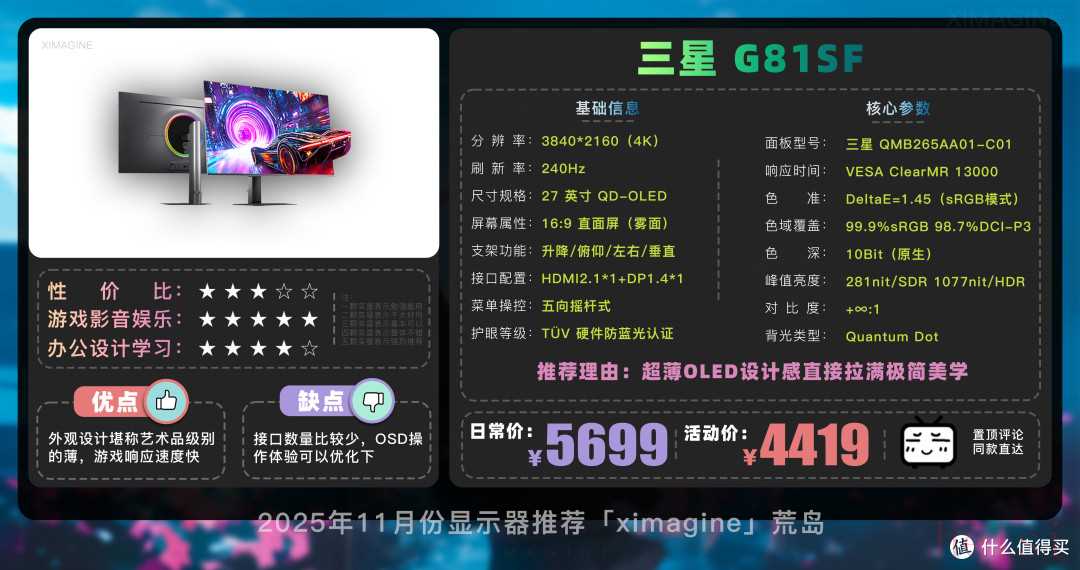 三星 G81SF 采用三星 AA01-C01 面板,超薄外观是它最吸引人的地方,放在桌面上,它的侧面薄得像一张纸,充满了未来感和科技美学。原厂 QD-OLED 面板带来的自发光特性,使得它的色彩表现力极强,尤其是那种黑与白的对比,非常抓眼球。用它来玩一些画面色彩丰富的独立游戏时,感觉每一个像素都在发光。它的响应速度是顶级的,玩任何游戏都不会有拖影。虽然它的接口设计和 OSD 操作不是那么人性化,但冲着它惊艳的外观和顶级的画质,这些都可以忍受。4419 元的它更像是一件摆在桌上的艺术品。