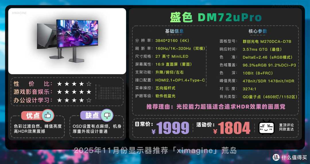 盛色 DM72uPro 采用群创 DCA-D7B 面板,这款显示器是为画质发烧友准备的。当播放一段拥有大量暗场和亮场对比的 HDR 视频时,才能真正感受到它带来的震撼。1152高分区的背光控制能力,4608颗灯珠让亮部细节清晰可见,而暗部则能黑得深邃纯粹,3274:1 画面对比度的提升是革命性的。用它来编辑视频素材或观看电影时,色彩的层次感和光影的立体感都达到了新的高度。不过为了容纳复杂的背光系统,机身会比较厚重,搬动起来不太方便。但当你沉浸在它带来的顶级画质中时,这些小缺点都可以忽略不计。1804 元的它还是很亲民的。