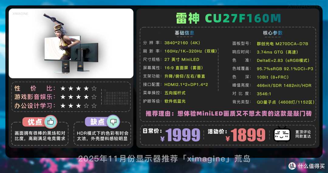 雷神 CU27F160M 采用群创 DCA-D7B 面板,它把高画质的 MiniLED 技术下放到了主流的 27 寸,并且兼顾了双模切换和高刷新率。这意味着不用在画质和速度之间做艰难的选择。玩游戏时,它能提供比普通 IPS 屏更深的黑色和更高的 1482nit HDR 亮度,让游戏世界的细节更丰富。同时 320Hz 刷新率也保证了画面操作的流畅感。OSD 菜单里有很多针对背光的调节选项,能够根据自己的喜好微调画面效果。如果你既想体验 MiniLED 的优秀画质,又不想牺牲游戏速度,1899 元的它是一个值得尝试的平衡点。