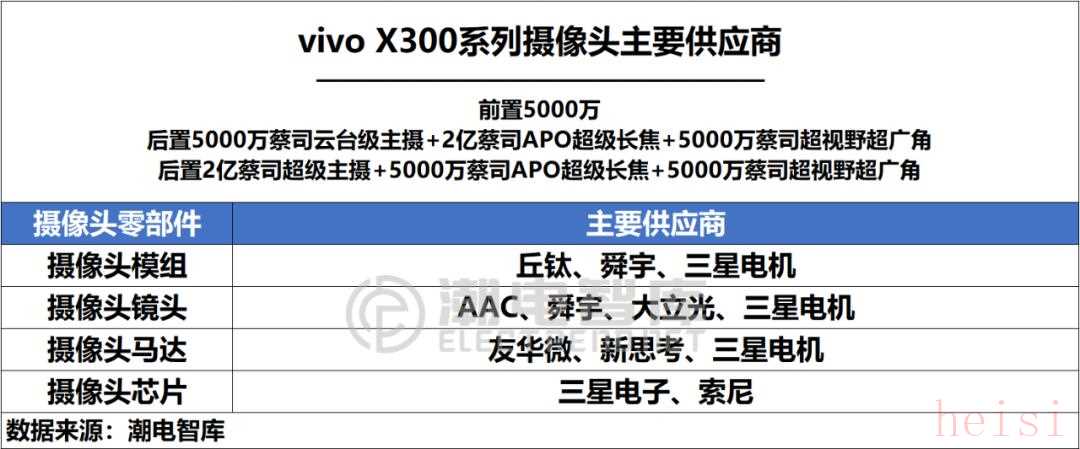 vivo X300 Pro采用了全新的蔡司三摄像头方案。得益于源自底层的像素架构优化和VCS仿生光谱技术,Pro版成功在85mm的镜头设计上实现了340mm的光学信号直出。此外,该版本超级长焦采用了1G+5P浮动潜望镜组方案,模组防抖能力为行业新高的CIPA 5.5的水平。潮电智库从手机产业链处获悉,vivo X300系列摄像头模组主要供应商为丘钛/舜宇/三星;镜头主要供应商为AAC/舜宇/大立光/三星;CMOS芯片主要供应商为三星/索尼;马达主要供应商为友华微/新思考/三星。