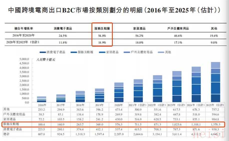 根据弗若斯特沙利文报告,从2016年以来,中国服装鞋履跨境电商保持高速增长,市场规模从2016年的1000亿元增长至2020年5760亿元,复合年增长率达到54.8%。