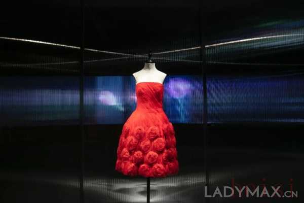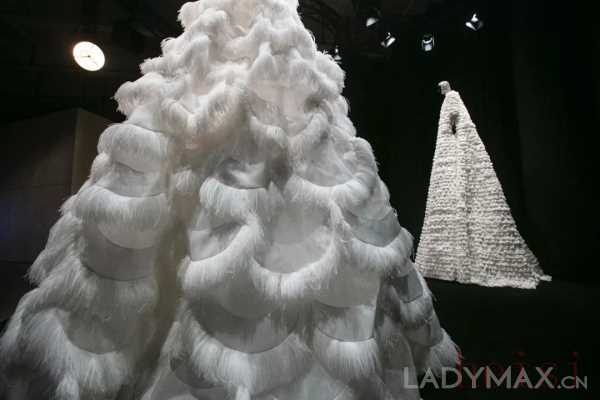 高定精神是品牌展览的第三个重要脉络。展览展示了三件来自2020秋冬高级定制系列的长裙,这个系列也因极长的裙摆而被称为“高跷裙”。现场设置了脚手架,令观众得以从高处欣赏裙子的细节。