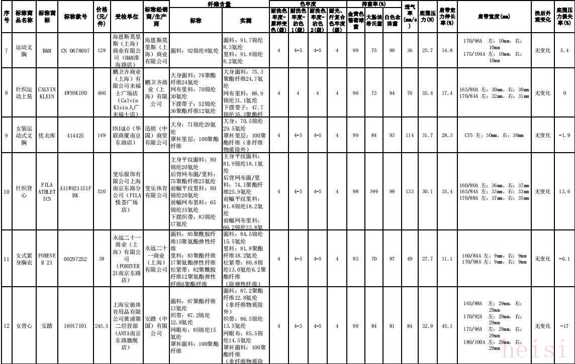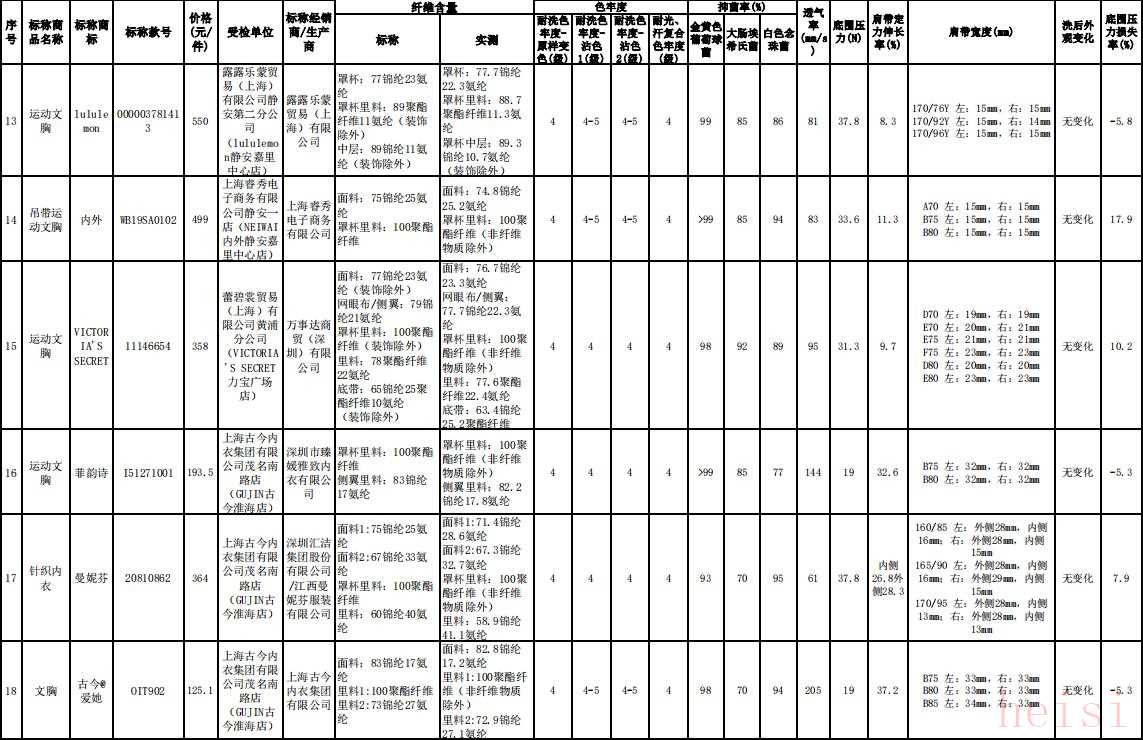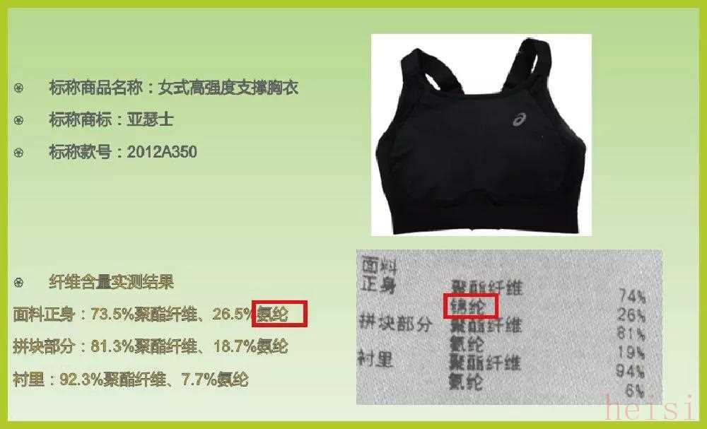 测试结果显示,全部样品均通过色牢度、抑菌的测试要求。值得注意的是,标称上海淮海中路ASICS第二分店由亚瑟士(中国)商贸有限公司生产销售的女式高强度支撑胸衣(标称商标:亚瑟士;标称款号:2012A350),纤维含量标识为“74%聚酯纤维26%锦纶”, 实际检测结果为73.5%聚酯纤维26.5%氨纶。纤维含量实测结果与标称有所偏差。