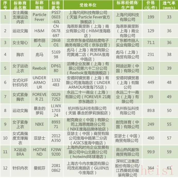 透气率排名靠后的三个品牌分别是:标称天猫Particle Fever官方旗舰店销售的、由上海尺间科技有限公司生产的女士高强支撑运动内衣样品(标称商标:Particle Fever,标称款号:PSS70603-60L),透气率为33mm/s;标称H&M上海淮海路店销售的、标称海恩斯莫里斯(上海)商业有限公司生产的运动文胸样品(标称商标:H&M,标称款号:CN 0678697),透气率为36mm/s;标称京东自营销售、由广东都市丽人实业有限公司生产的女士背心样品(标称商标:都市丽人,标称款号:2B6B01)透气率为36mm/s。