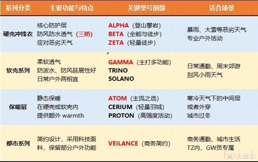 今天我用自己这几年的户外积累,简单做个易于理解的梳理:这个品牌的产品命名其实有规律可循,掌握了规律,你就能通过名字大致判断出一件衣服的定位和功能。