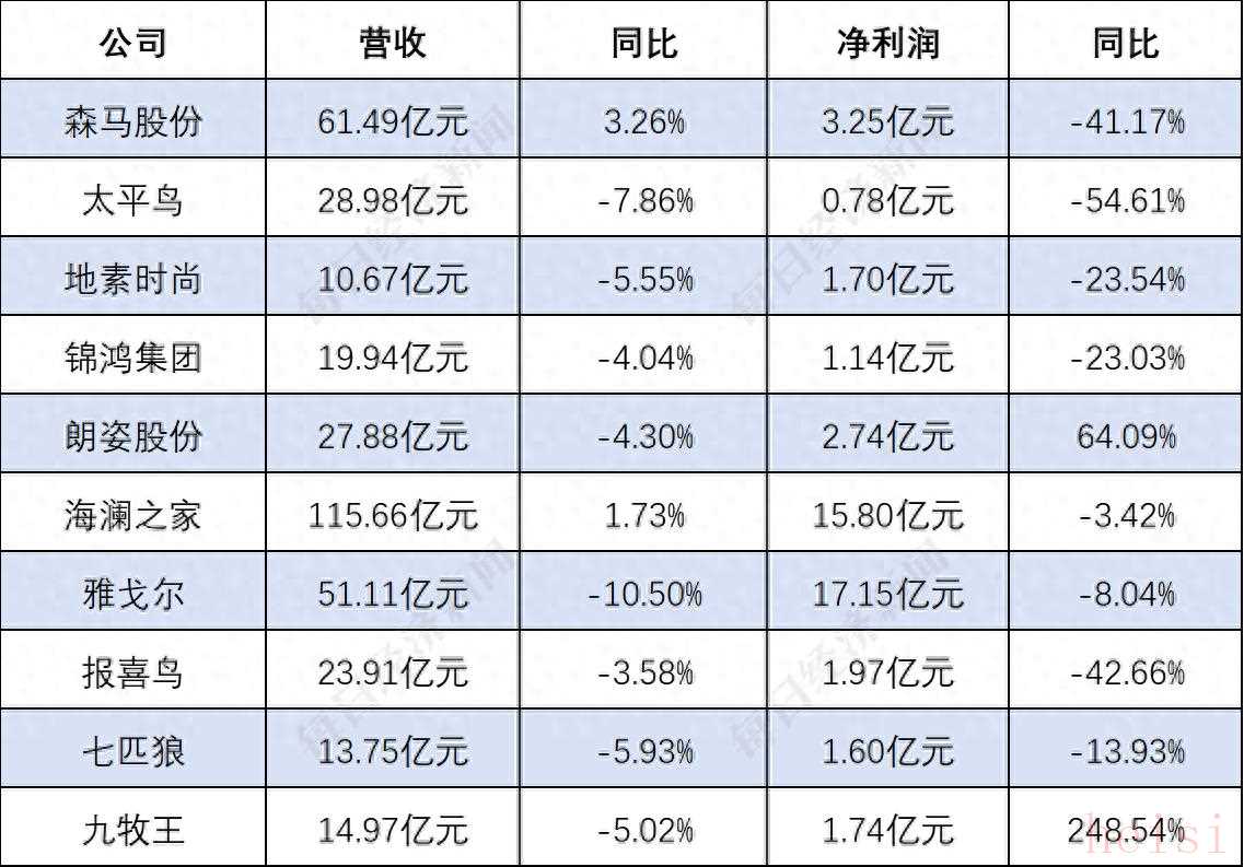 男装方面,九牧王、雅戈尔、报喜鸟、七匹狼营收均呈现个位数下滑。只有海澜之家营收同比增加1.73%,但其净利润也下降了3.42%。