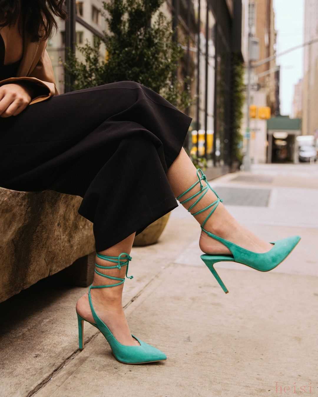 NINE WEST的绑带高跟鞋也是够亮眼,这款绿色的绒面鞋子,后绑带可以缠绕5圈,自带性感气质。但是这种设计风格不太适合年龄30岁以下的姐妹,因为它太成熟了,除非你有足够的气场,不然真不建议你试。