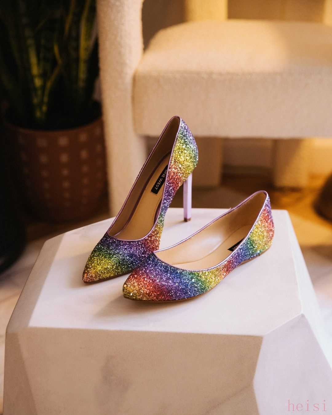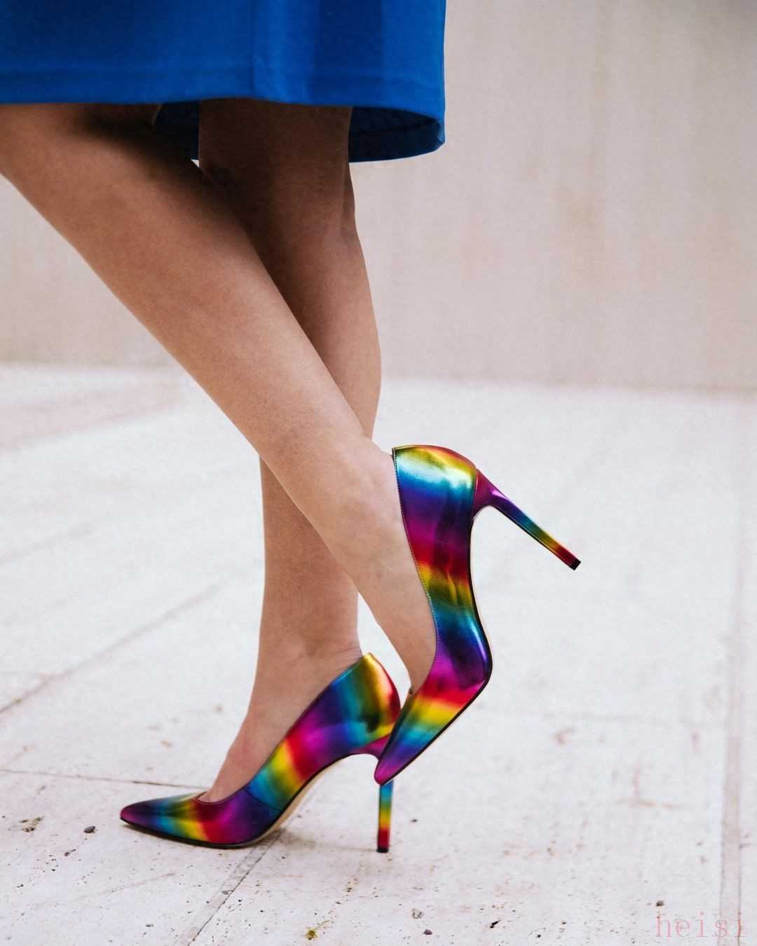 同样炫彩款式的高跟鞋也有9厘米的超高跟,这种类型的高跟鞋就不太适合平时通勤穿了,虽然真的很好看,穿上脚流光溢彩,鞋身到处都散发着迷人的光芒,但实在是难驾驭。如果你需要一双高跟鞋用来出席重要的场合的话,它倒是很适合的,毕竟不用穿太久,颜值在线就可以了。