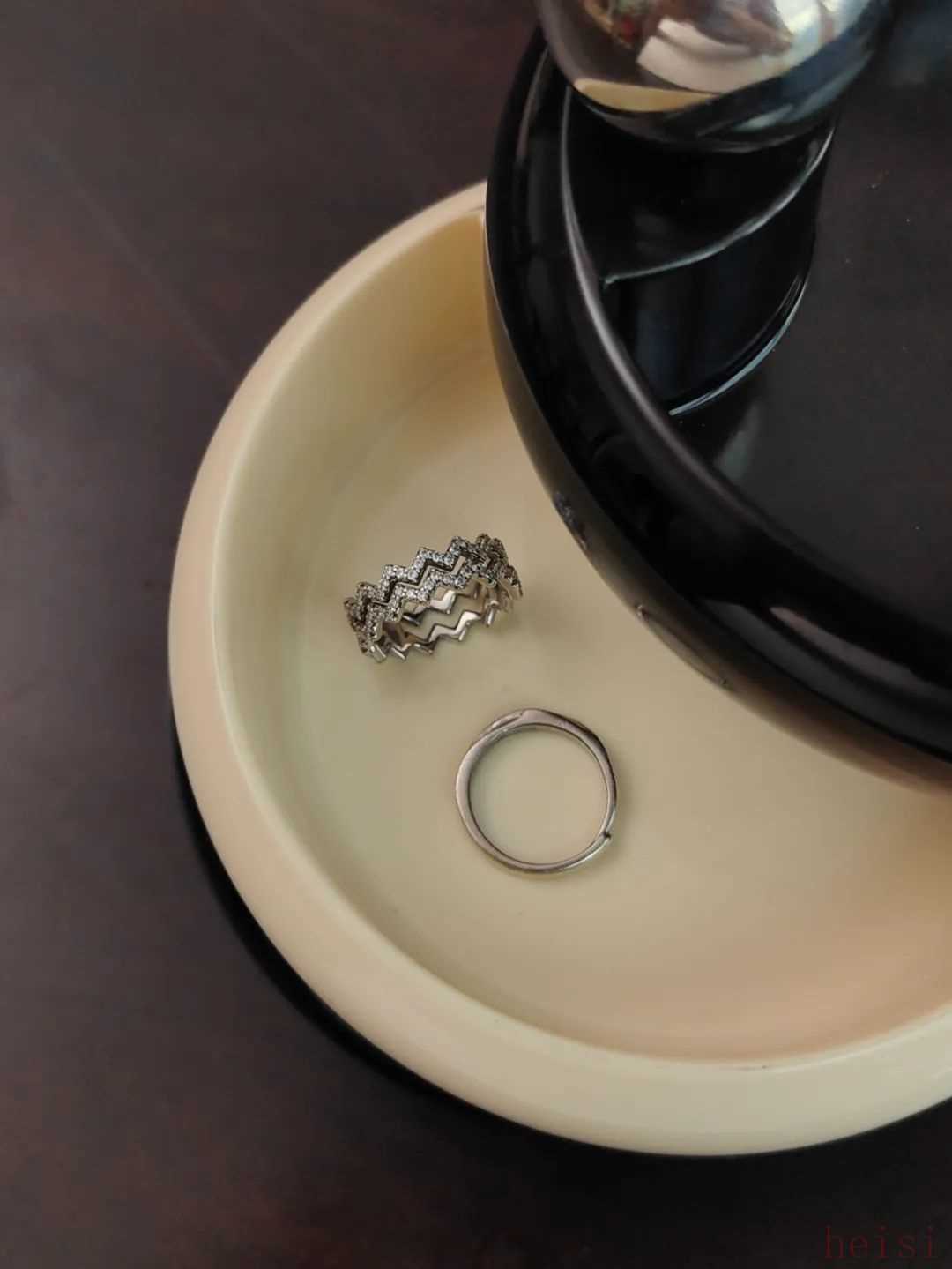 常戴的两枚戒指。自带叠搭设计的这款(左)我也很喜欢,简约又有设计感,来自六福珠宝。▼