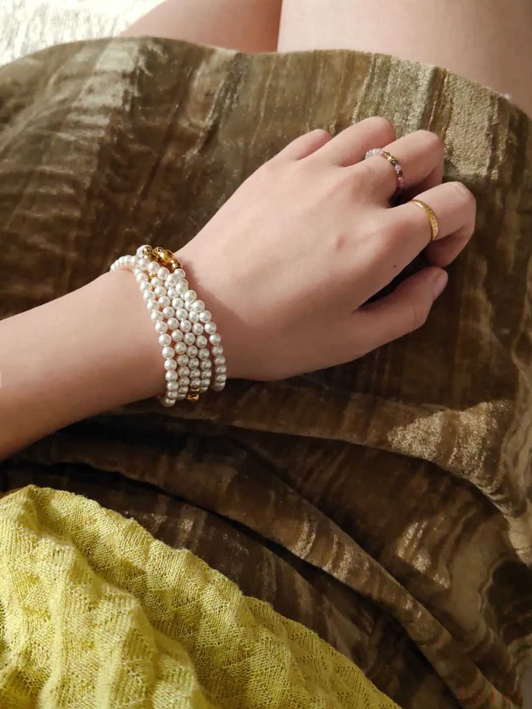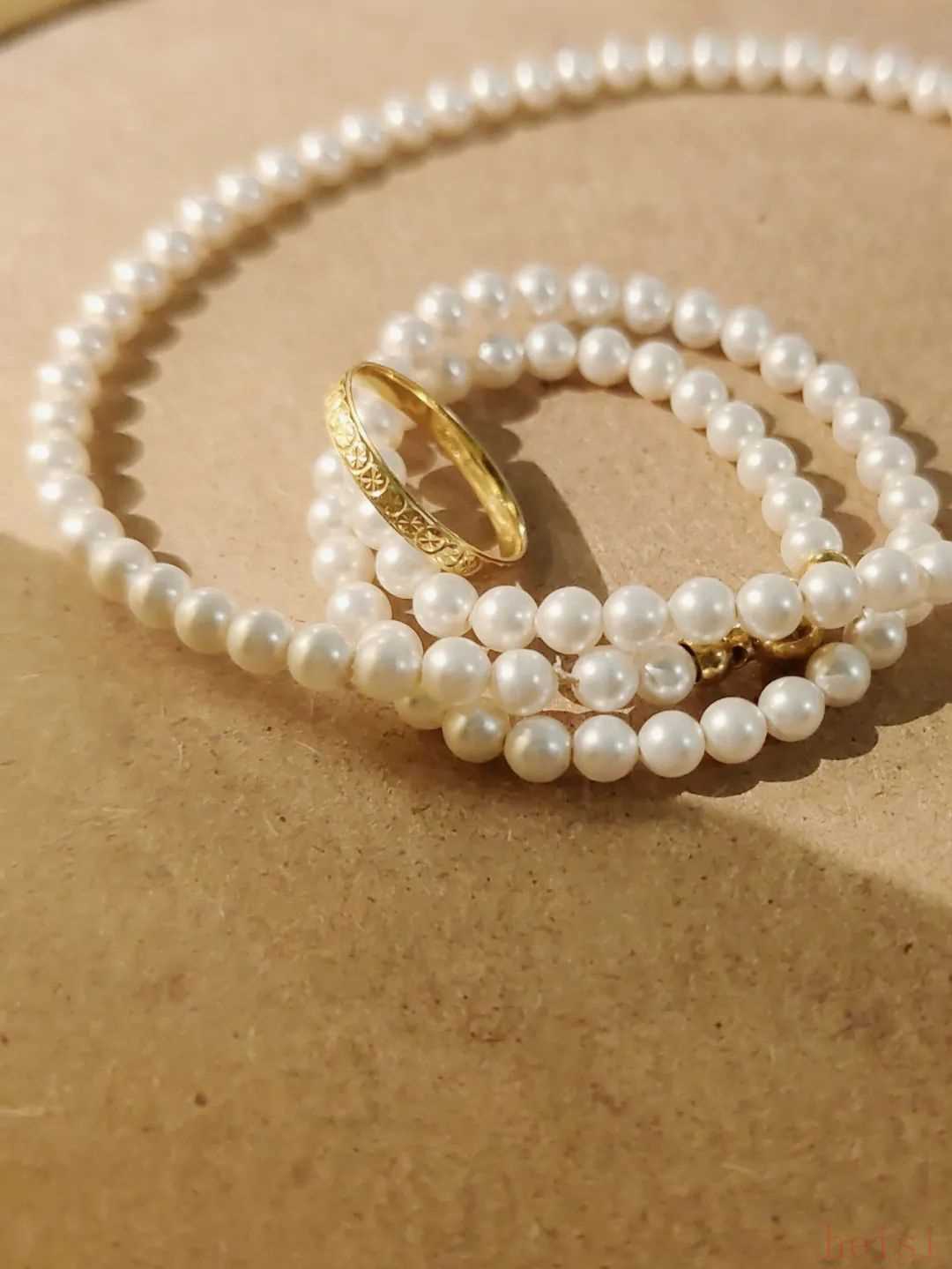 小直径珍珠(4mm)会比较年轻,叠很多层也不会显得珠光宝气。扣子的小金珠刚好和金戒指小小呼应下。▼