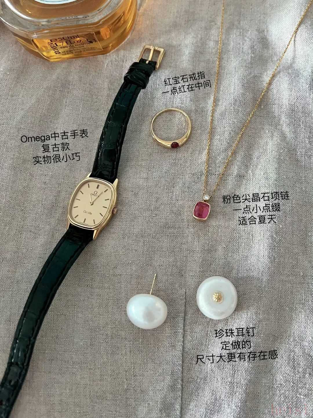 有一阵子特别喜欢逛广州的珠宝城,经常去。红宝石戒指和粉色尖晶石项链都是当时的战利品。这条项链还蛮特别的,一点亮晶晶的粉很适合夏天。它的另一面是金色的,反过来戴也好看。