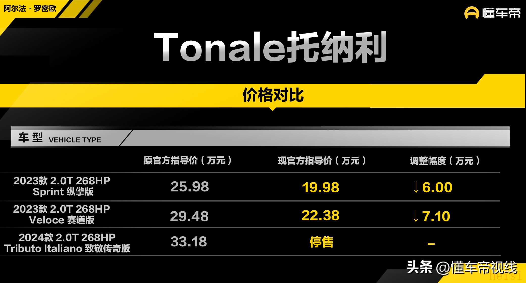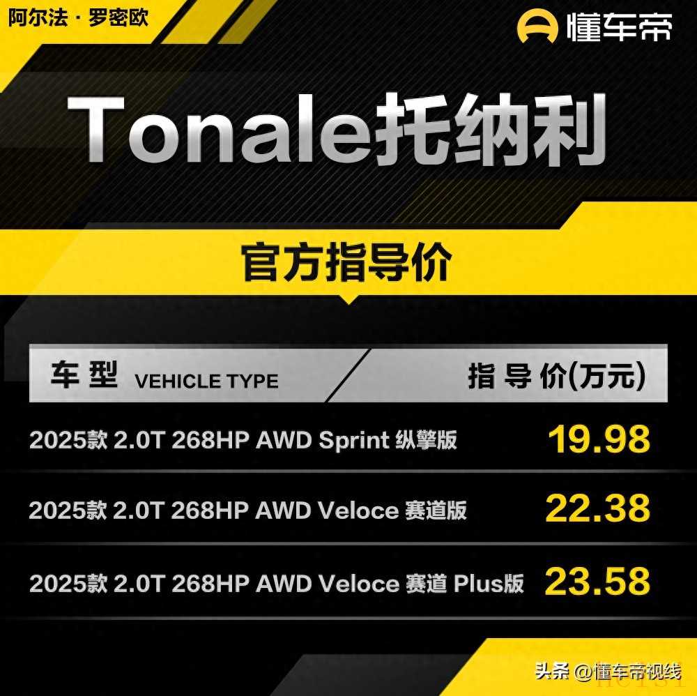 12月23日,阿尔法·罗密欧官方宣布,2025款Tonale托纳利上市。新车推出三个款型可选,指导价为19.98万-23.58万元。与旧款相比,2025款Tonale托纳利“Sprint 纵擎版”和“Veloce 赛道版”指导价有所调整,分别下降6万元和7.1万元。本次价格调整后,Tonale托纳利系列指导价门槛从旧款的接近26万元,降低至20万元以内,旧款指导价为33.18万元的顶配款型“Tributo Italiano 致敬传奇版”停售。