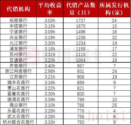 从代销银行来看,作为财富管理的重要一环,股份行代销理财最为积极,在代销产品数量上表现亮眼,招商银行、中信银行包揽冠亚军。