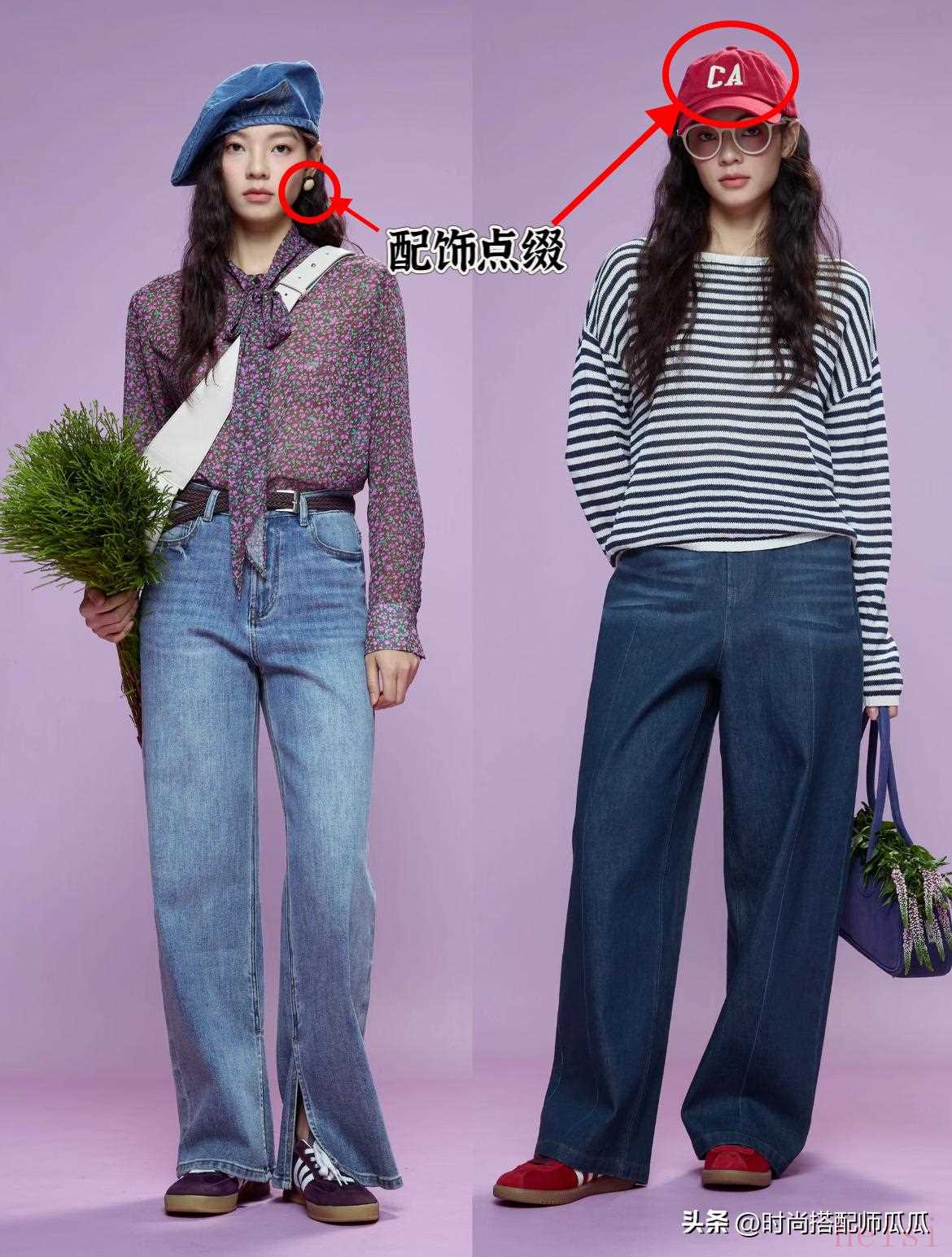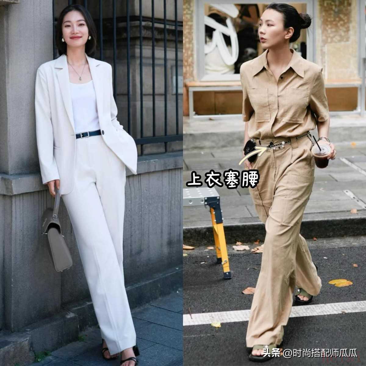 单纯的“上衣下装”,就要通过“塞裤腰”实现目标,将上衣多余的衣摆塞进裤腰,再适当抽出保留空间感,系根腰带更显腿长。