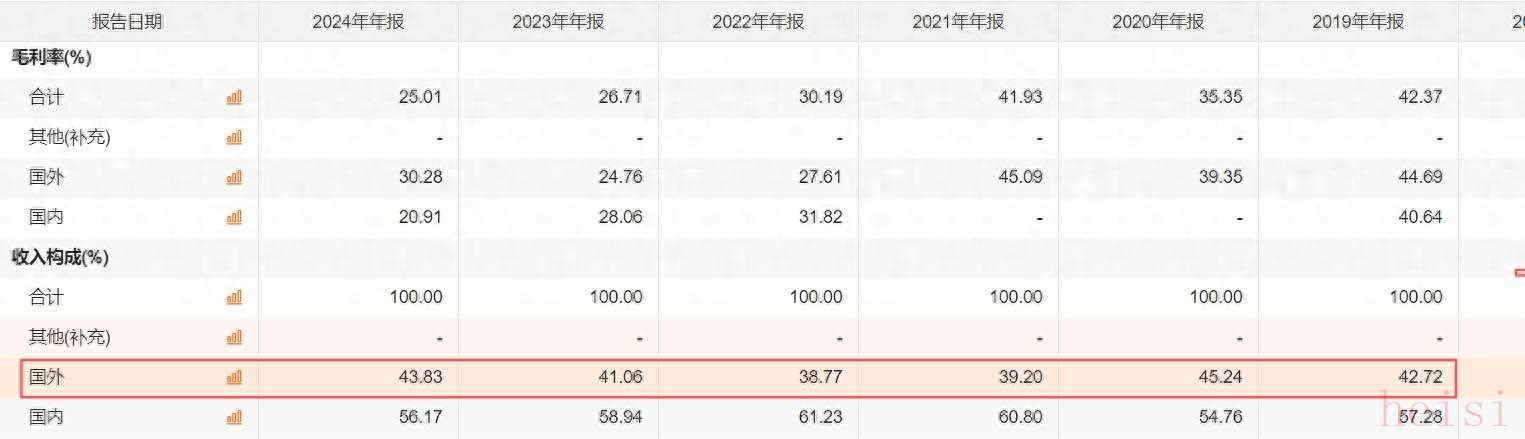 根据界面新闻统计,2019年至2024年海外营收从48.52亿元涨至120.6亿元,2020年至2024年海外营收同比增长分别为31%、26% 、16%、17.6%和9%。