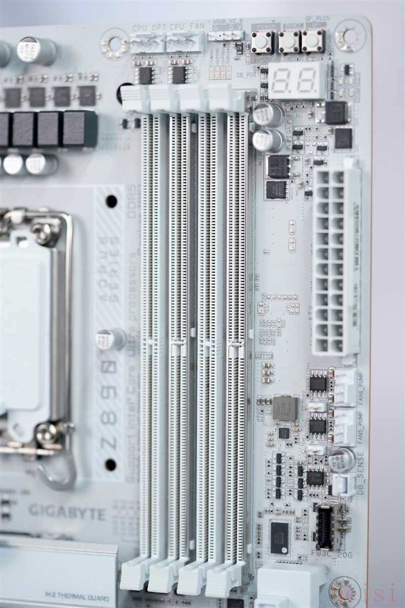 技嘉Z890 AORUS XTRME AI TOP主板的四根DDR5内存插槽,首选使用的第二、四插槽还使用了金属结构强化,更加耐用。