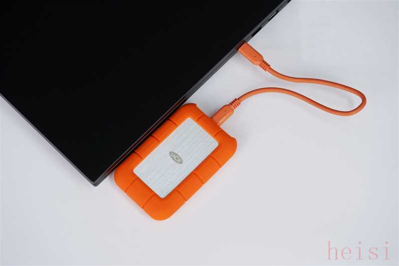 LaCie Rugged SSD4金刚钻Plus并没有采用超薄设计,十分厚实的橘色防撞边框提供了极为可靠的防护能力,拿在手里的防滑效果也极佳,几乎不可能发生意外脱手的情况。