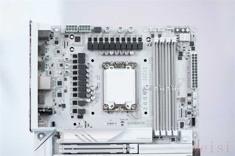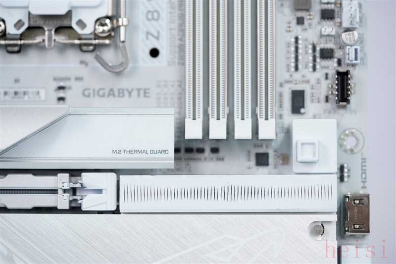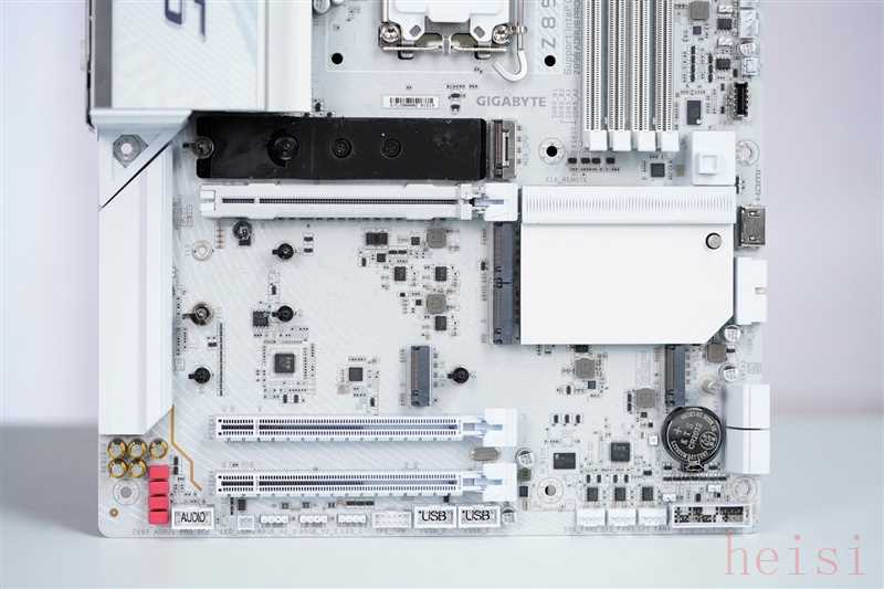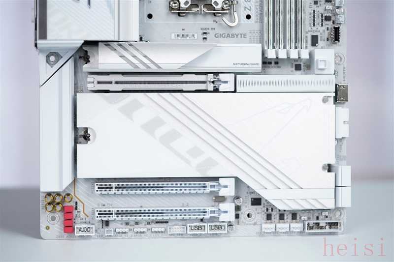 拆下白色的SSD散热片之后,可以看到技嘉Z890 AORUS XTRME AI TOP主板提供了高达5个M.2 SSD插槽,扩产能力极强,显卡插槽上方的PCIe 5.0 x4 SSD位置提供了加厚的散热器,保障高性能的PCIe 5.0 SSD的散热需求。