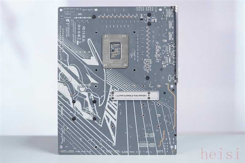 技嘉Z890 AORUS XTRME AI TOP主板的背面采用了银灰色设计,印有大面积的AORUS图案和Logo。