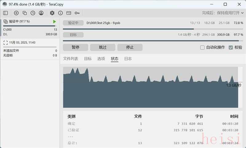 我们准备了300G的文件,使用Teracopy软件拷贝至LaCie Rugged SSD4金刚钻Plus中,并在写入完成后进行数据校验,模拟日常使用中最常见的操作,测试移动SSD在真实使用中的性能表现。