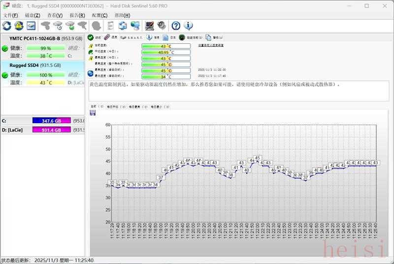 我们在进行CrystalDiskMark 64GB测试时,同步记录了LaCie Rugged SSD4金刚钻Plus内部传感器记录的温度数据,室温23度的环境下,可以看到得益于自身较大的体积,温度上升并不剧烈,同时最高温度也仅有45度,完全可以拿在手中使用,只有一点温热感。