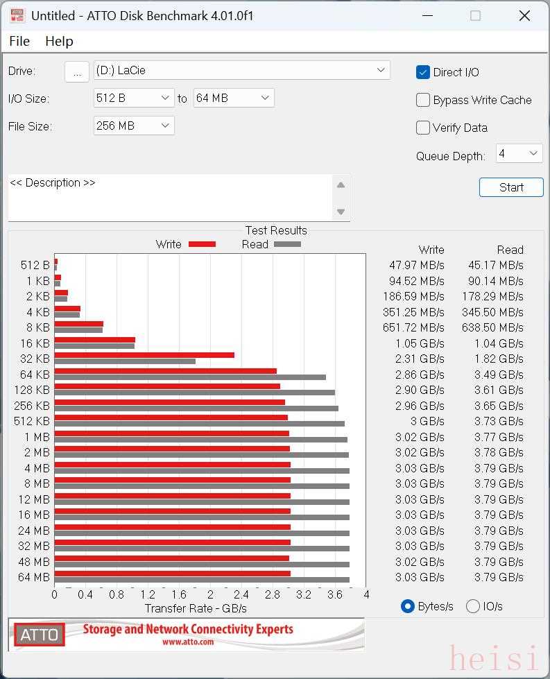 LaCie Rugged SSD4金刚钻Plus在ATTD Disk Benchmark测试中,0.5k的小文件也能有超过45MB/s的速度,从16k文件开始读写速度超过1GB/s,从64k文件看是读写速度都超过了3GB/s,性能达到最高水平。