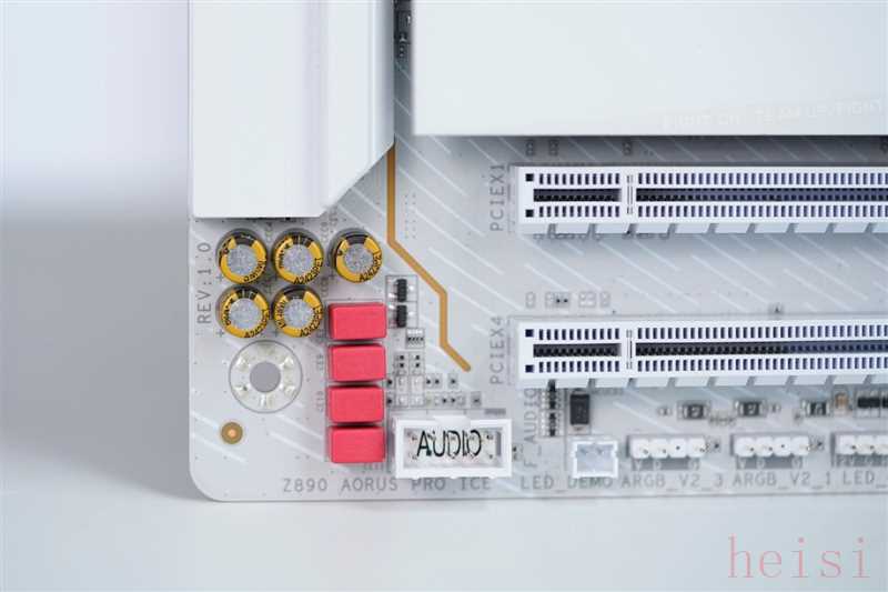 技嘉Z890 AORUS XTRME AI TOP主板左下角的音频专属金色电容和红色电感元件特写。