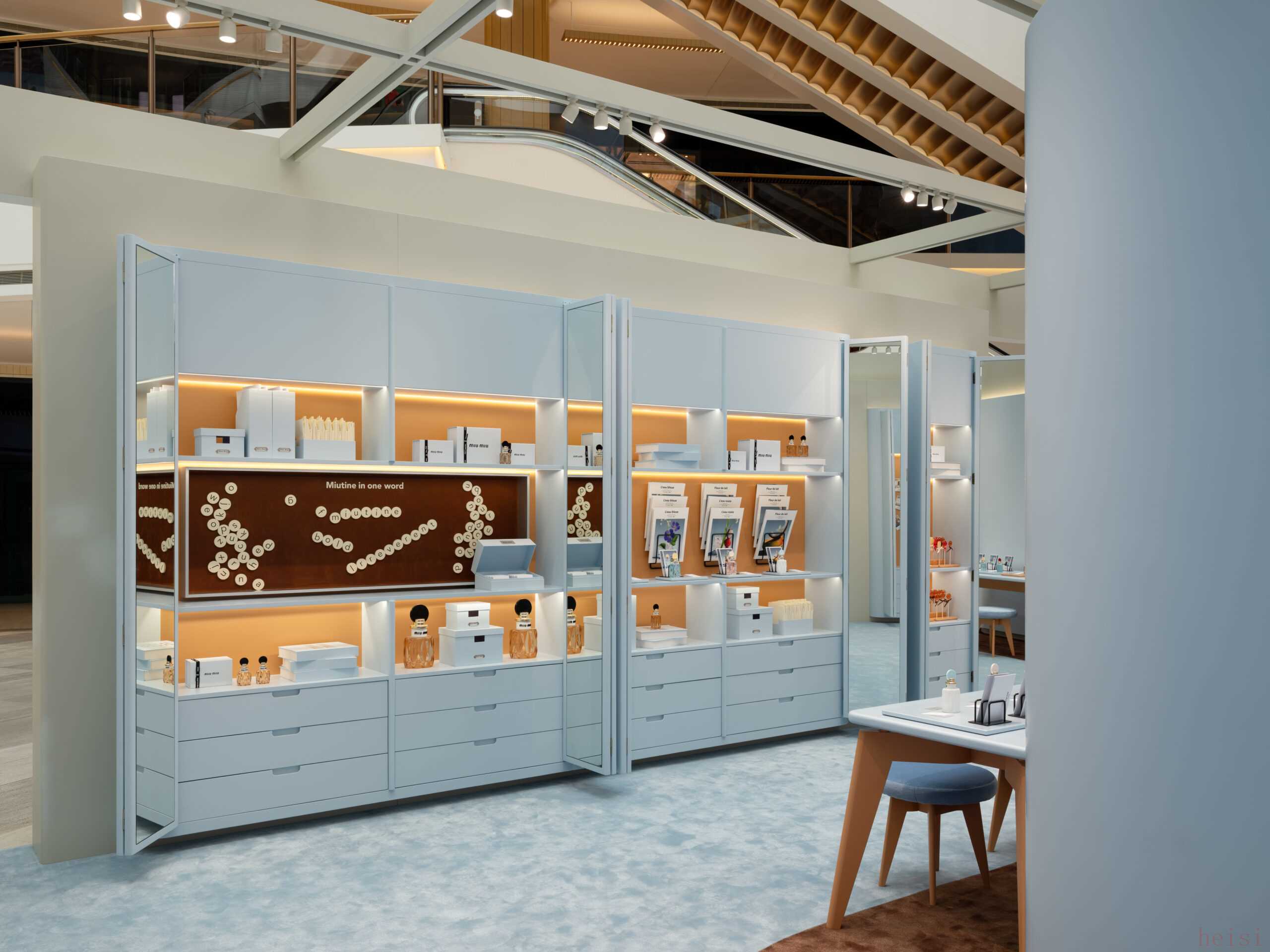 限时精品店以 Miu Miu 女孩的衣橱为灵感,演绎专属于 Miu Miu 的随性气质:衣橱不仅存放服饰,亦珍藏着迷人的香氛。品牌标志性 Azzurro Blue 天蓝色构建限时精品店的核心轮廓,经典系列香气作品陈列其中,开启自在感官创想。