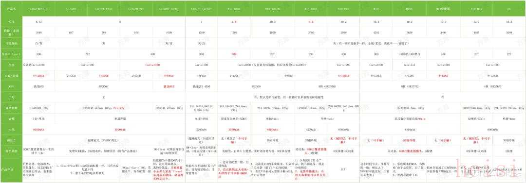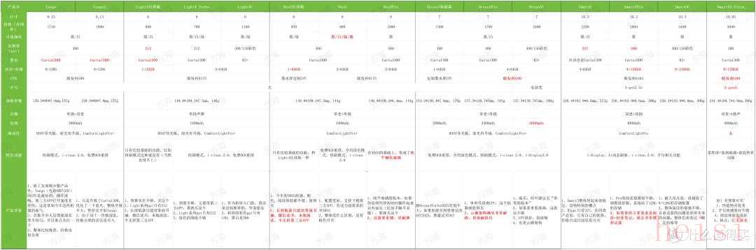咱们也不废话,首先,这次我做了一个超级大的表格,里面包含了掌阅、文石、汉王 3 个品牌在售的所有产品的参数对比。