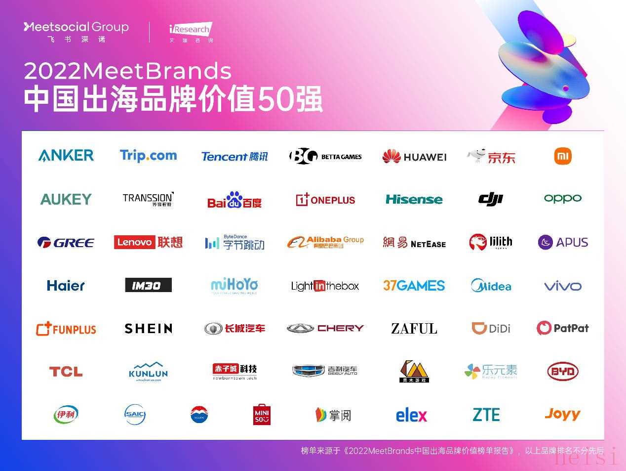 在此背景下,为助力中国出海企业突破全球化发展瓶颈,飞书深诺集团联合艾瑞咨询发布《2022MeetBrands中国出海品牌价值榜单报告》,该报告由新华社《中国名牌》杂志社、中国环球公关特提供特别顾问支持。