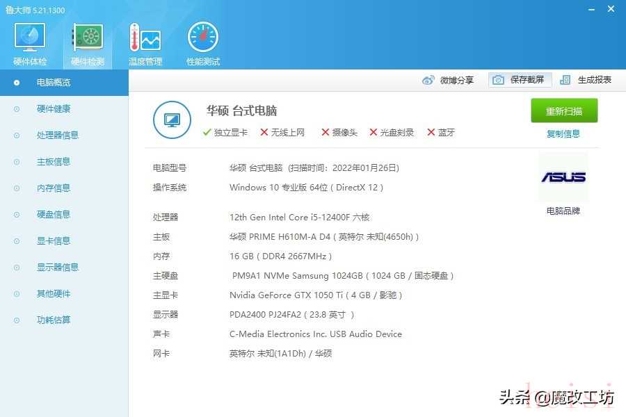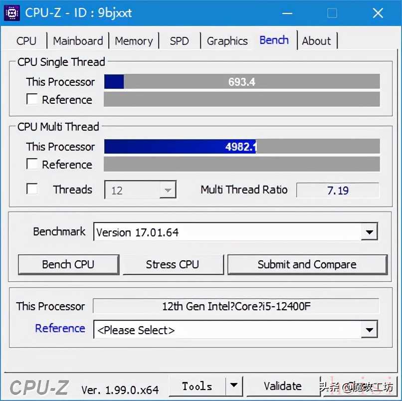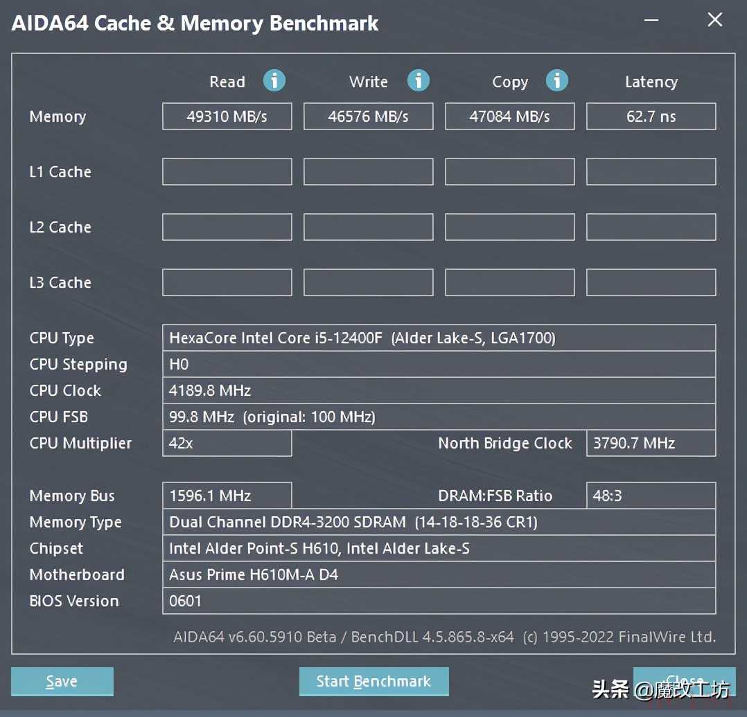 上面这张图是魔改君刚跑的分,处理器是已经入手使用近一个月的INTEL 酷睿I5-12400F处理器,主板则是一张ASUS大师入门级的H610M-A D4。