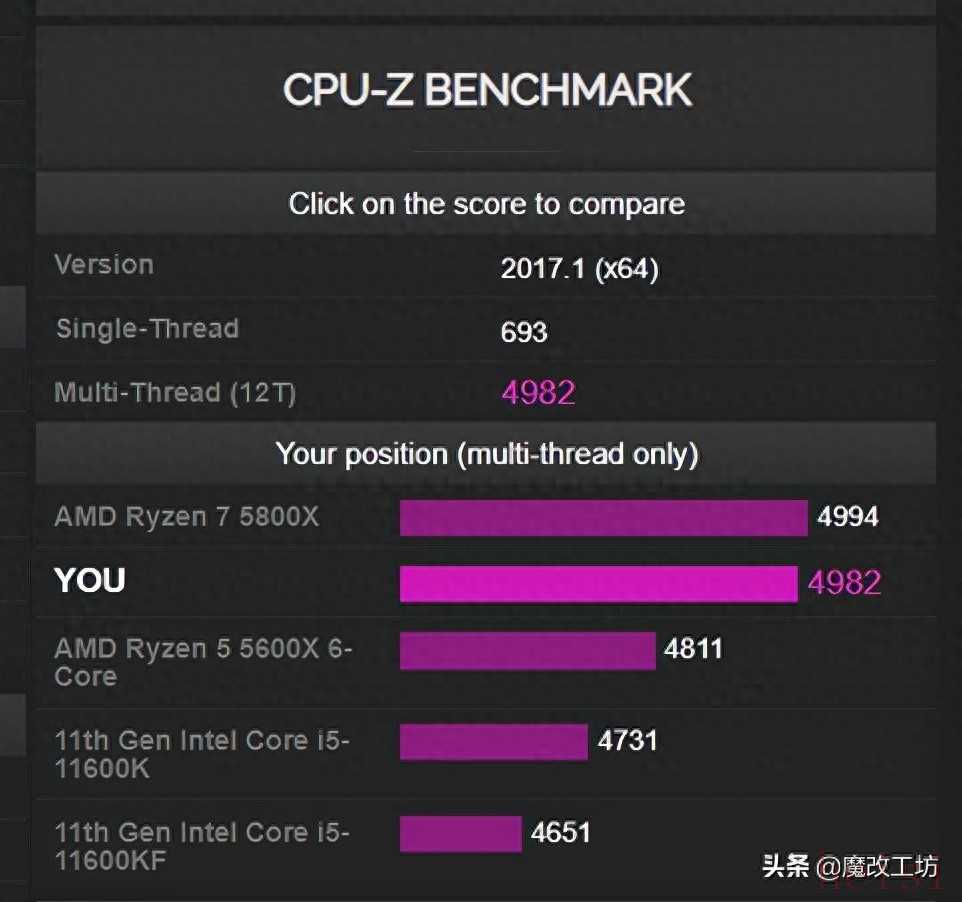 CPU-Z的多核跑分=4982分,在官网数据上,已经打平了AMD R7 5800X。