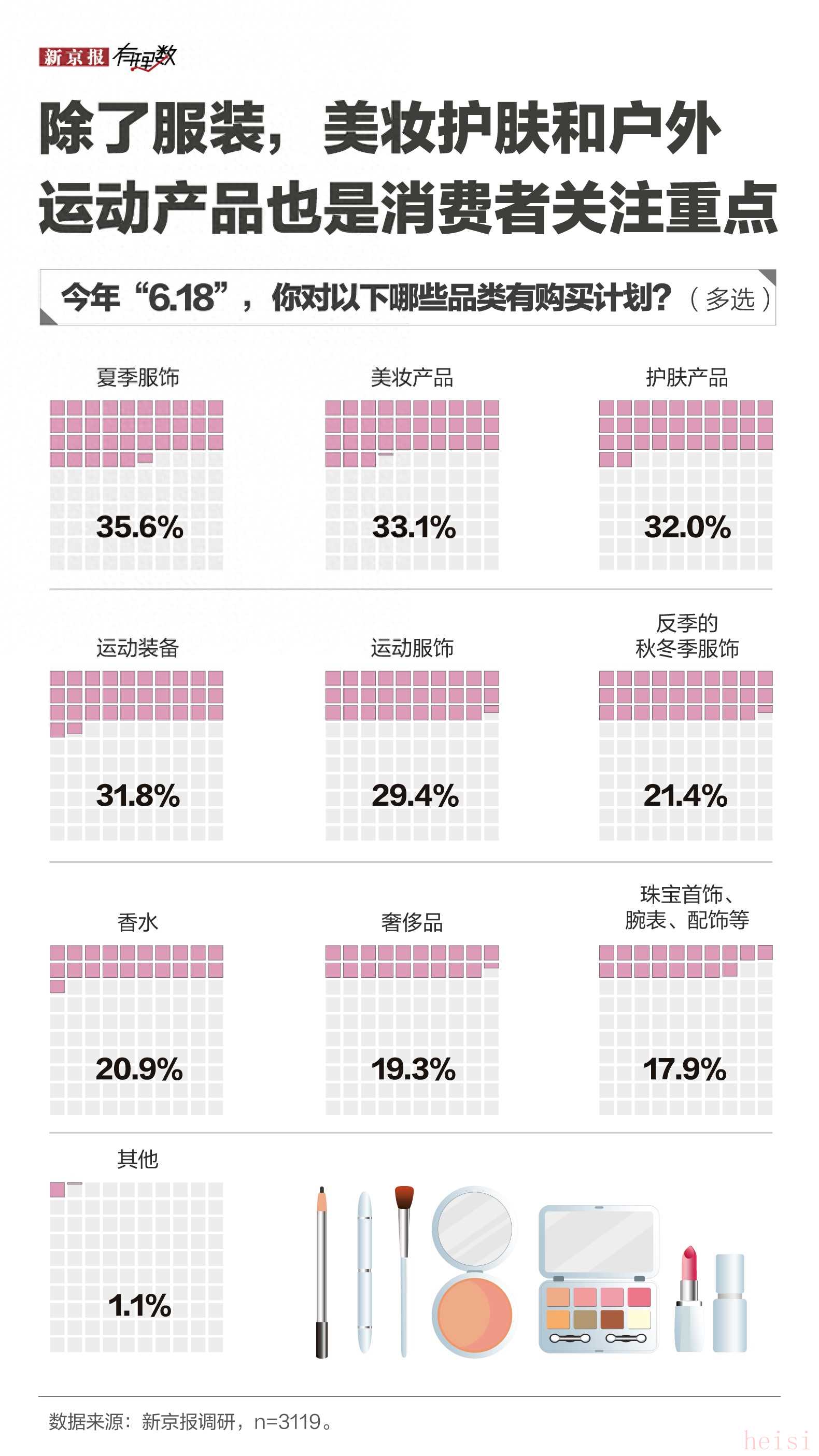 今年“6·18”,消费者在购物选择上更加多元和理性。除了服饰,美妆护肤和户外运动产品成为刚需。在今年“6·18”的购物计划中,33.1%和32%的消费者打算购买美妆产品和护肤品;31.8%和29.4%打算购买运动户外装备和运动服饰。
