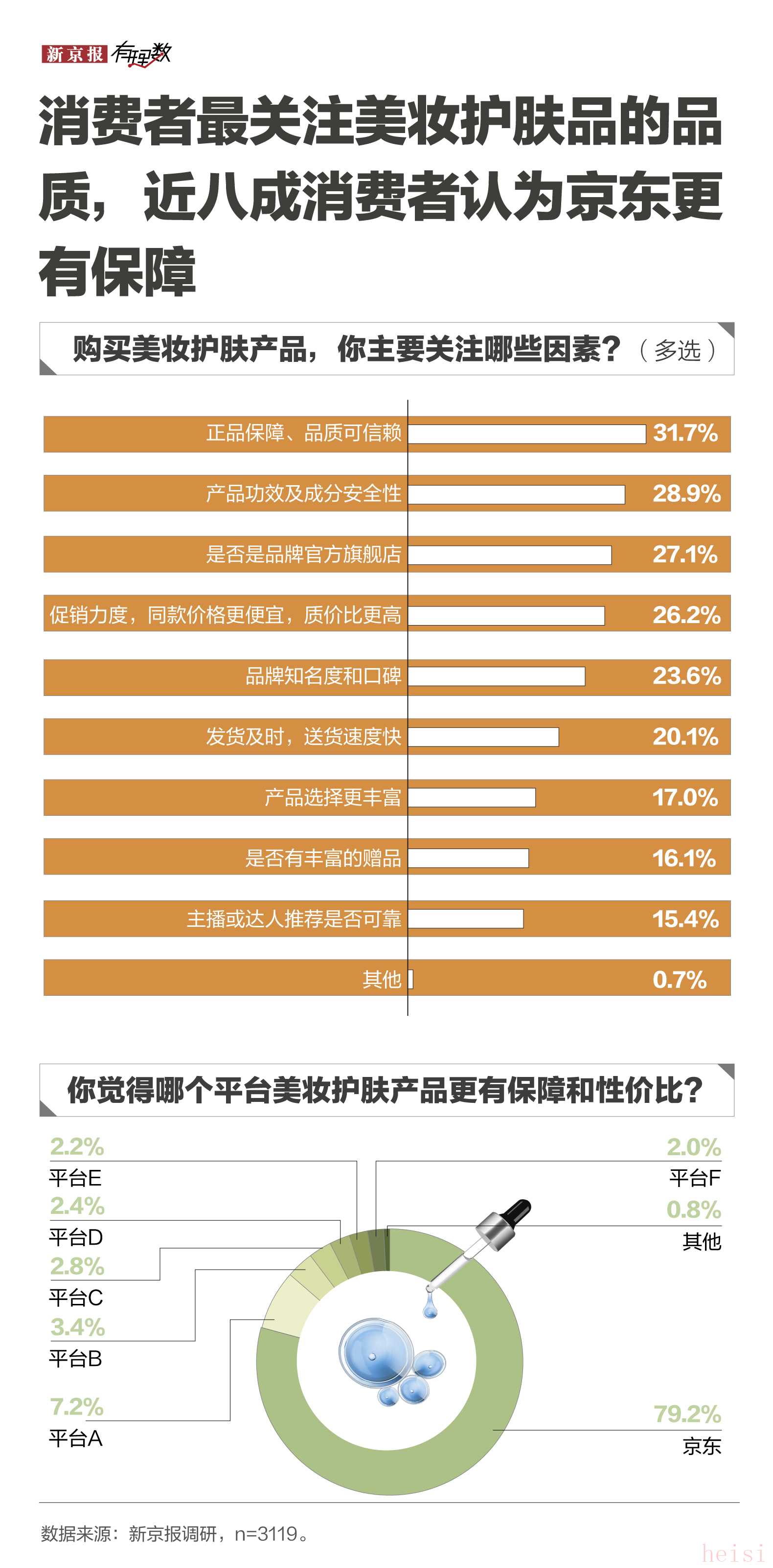 在选择购买平台时,79.2%的消费者认为京东的美妆护肤产品更具有品质保障、价格更具优势。除了大牌正品有保障,货源可靠之外,物流配送快能快速收货,以及售后服务好退换货方便,也让更多用户选择京东,在快节奏生活和注重消费体验的当下,这几个因素尤为重要。