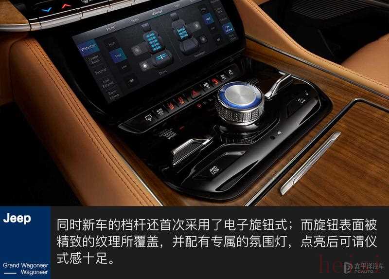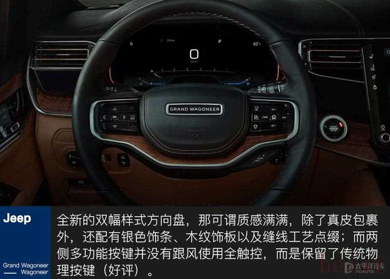 同时,方向盘中间的标识并未像其他Jeep车型那样配有“Jeep”标识,而是直接使用了“Grand Wagoneer”车型名称。
