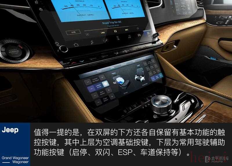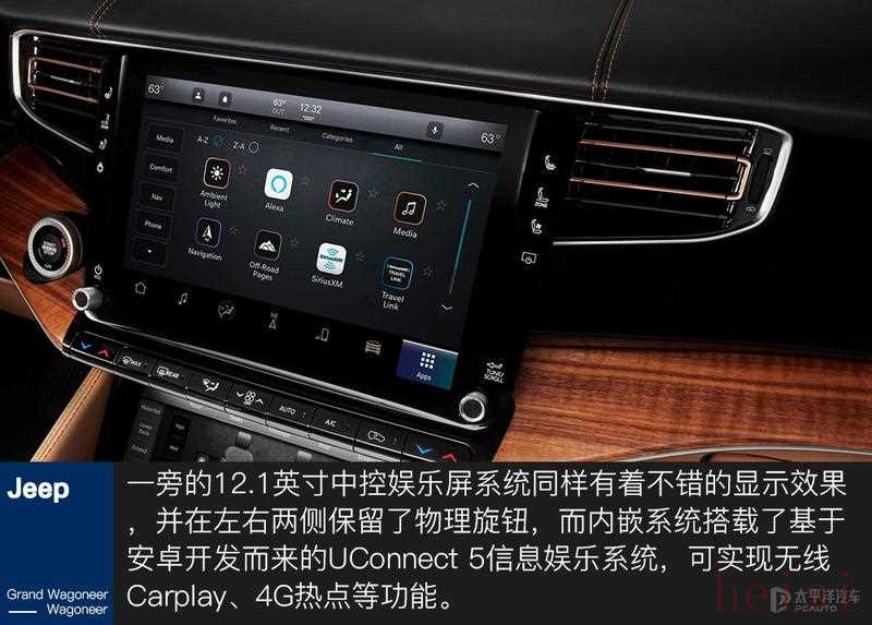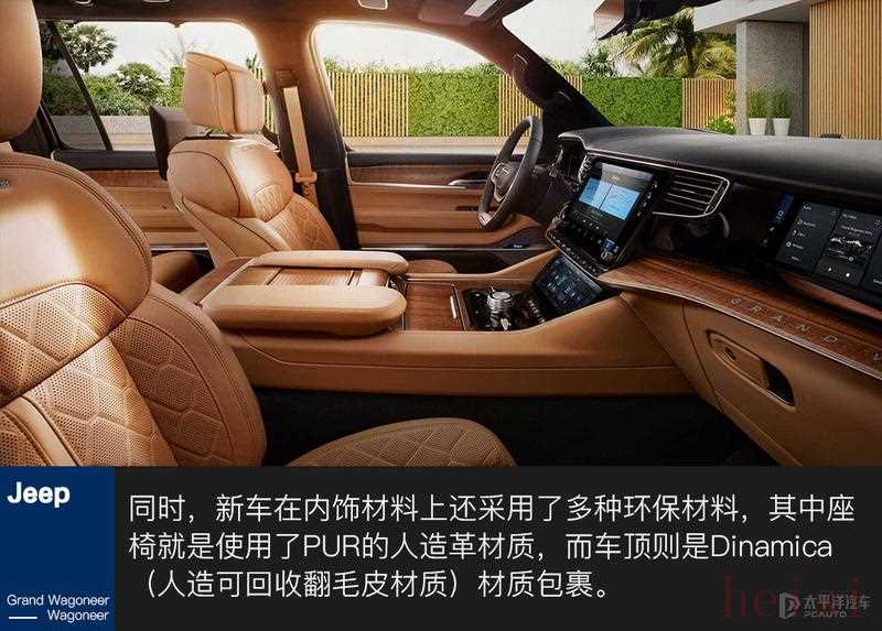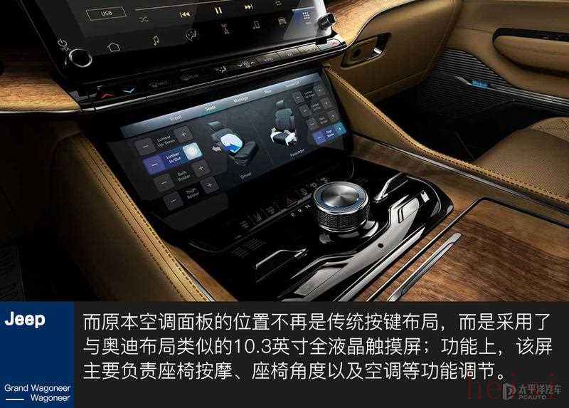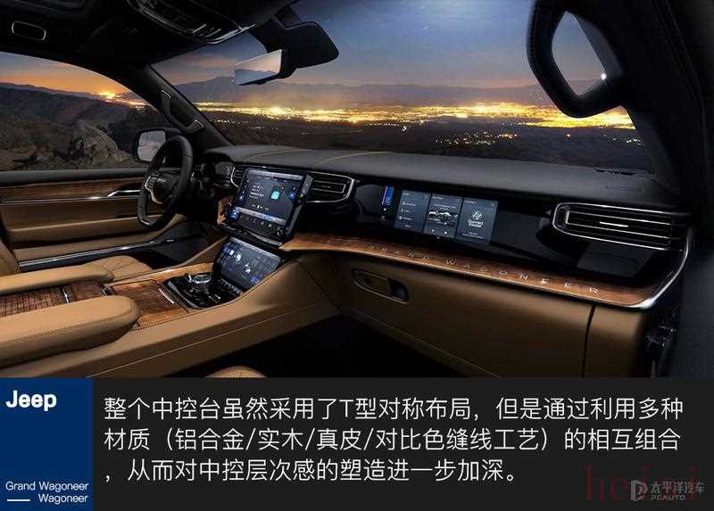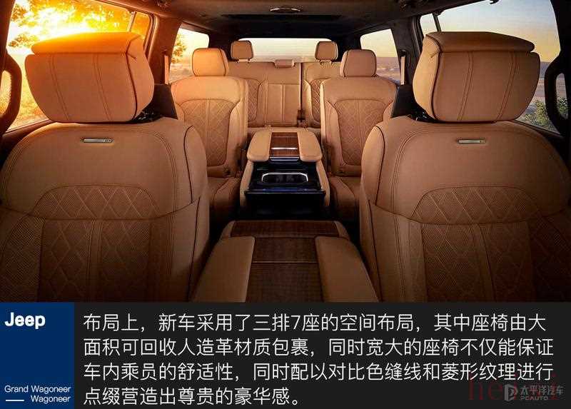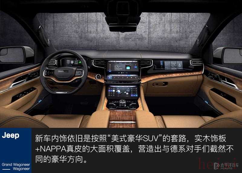 全新一代Wagoneer瓦格尼的内饰设计可以说变化的非常彻底,整体充满了“美式豪华”的味道,比如它有宽裕的车内空间、大量覆盖的皮质+木质饰板、宽大厚实的中央扶手等等。