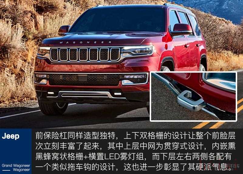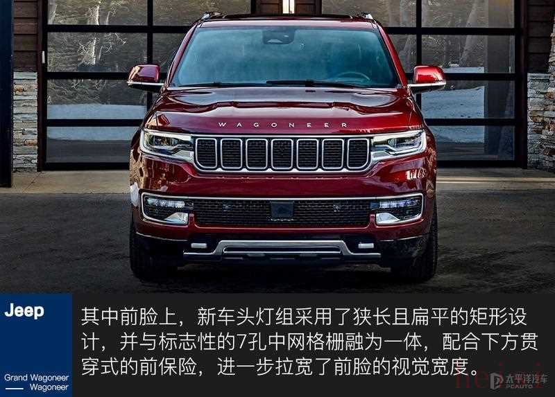 全新一代Wagoneer瓦格尼采用了Jeep家族最新一代设计语言,整车看起来更加具备硬派气息,标志性的七孔式进气格栅搭配更窄的前大灯组,使得新车看起来更加具备未来感。