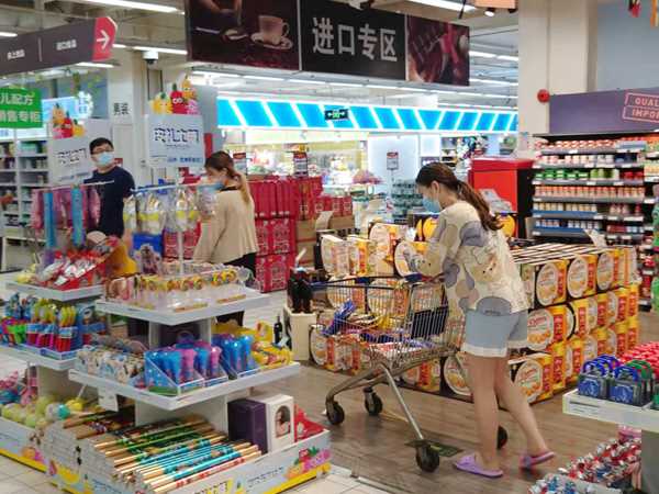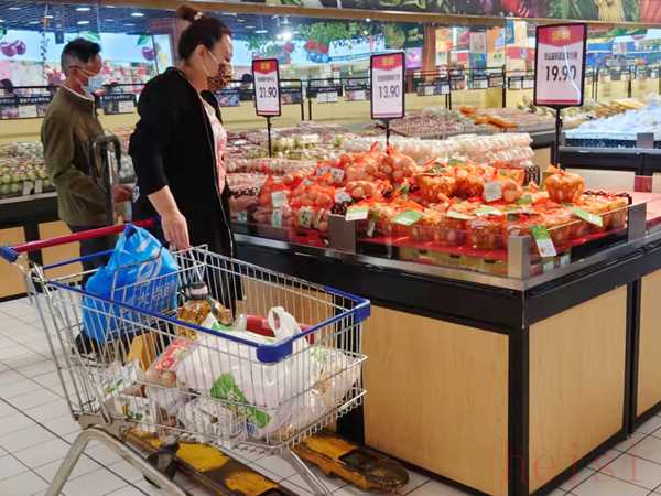 华润万家超市是周浦万达广场内较早恢复经营的店铺,目前的顾客以周边防范区居民为主。在生鲜果蔬区域内,受欢迎的时令水果、鲜活水产已备足货源,供前来采购的居民挑选。