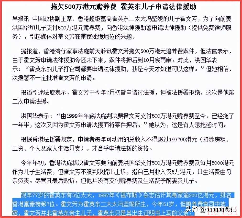 2001年,霍英东这位名义上仍旧是霍家少爷的继子,却突然因为向前妻和儿子支付500万港元的赡养费,而请求法律援助。