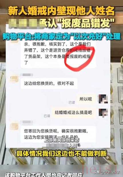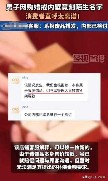 项先生表示,“如果是普通商品的戒指,我不会过多计较的,但婚戒寓意比较特殊。”随后,项先生第一时间就联系了商家客服,还向商家提供了自己婚礼佩戴婚戒的相关证据。客服最开始的时候回应称,可能是发货过程中出现了人工操作错误,但后来又改口说这枚戒指原本为他人定制的,但因订单取消或质量问题被标记为了“报废品”。