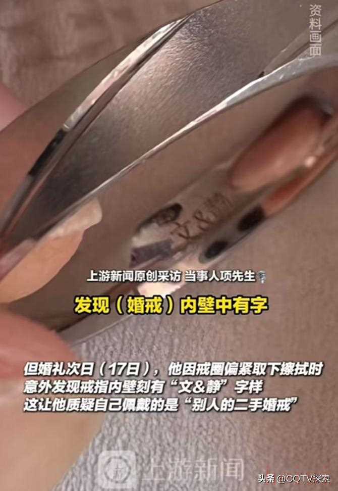 本来是象征婚姻承诺的婚戒,竟遭遇“二手货”?据光明网10月24日报道,广东东莞的项先生在婚礼次日取下来戒指擦拭的时候,竟意外发现戒指的内壁刻着“文&静”字样,这让他一下傻眼了……